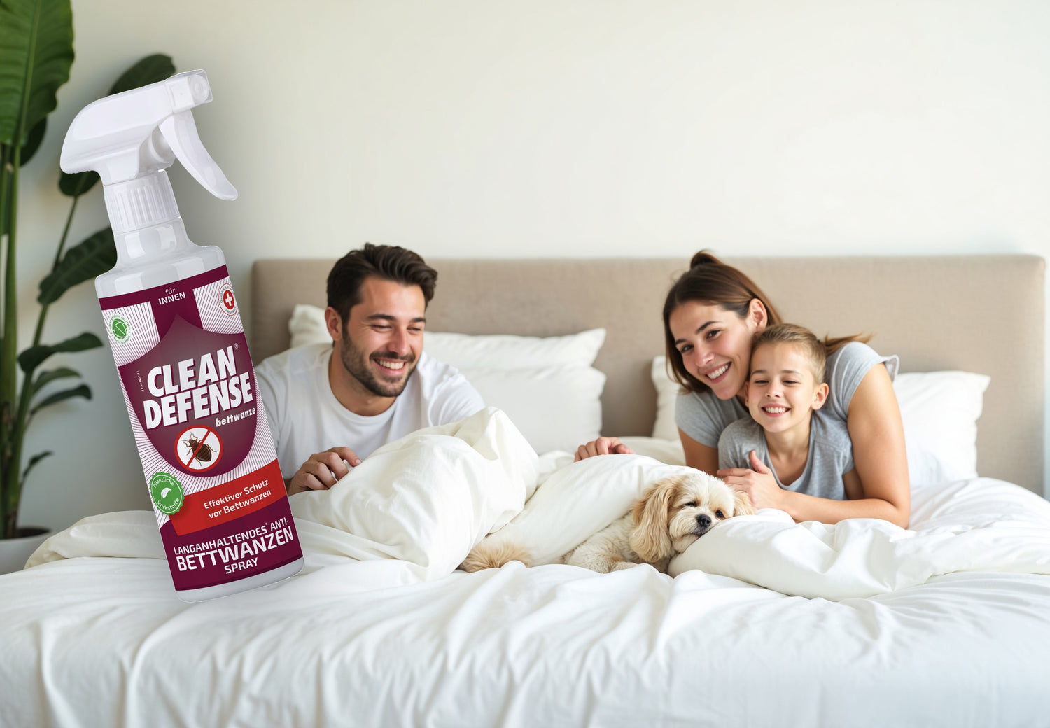 CLEAN DEFENSE® Bettwanzen-Spray schützt effektiv vor Bettwanzen und Milben im Innenbereich – ideal für Matratzen, Polstermöbel, Teppiche und andere Verstecke. Für anhaltenden Schutz regelmäßig anwenden.